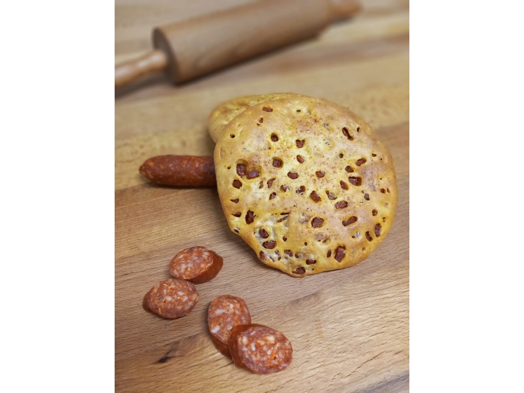 "Poctivé pečivo s pikantním šmrncem. Čabajková placka je nadýchané těsto, které zdobíme kousky klobásy. Skvěle se hodí na rychlou svačinu, k večeři nebo jen tak na zobání."
