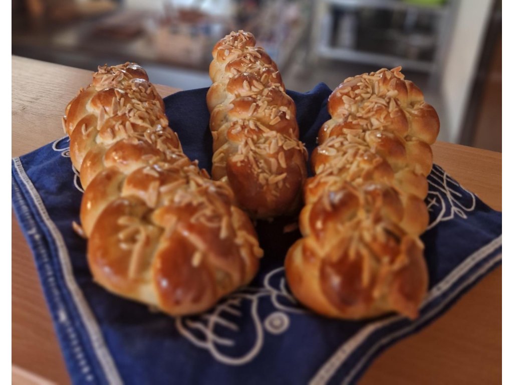Ručně pletená vánočka připravovaná z kvalitních surovin podle tradiční receptury. Nadýchaná, voňavá a vždy čerstvě upečená.
